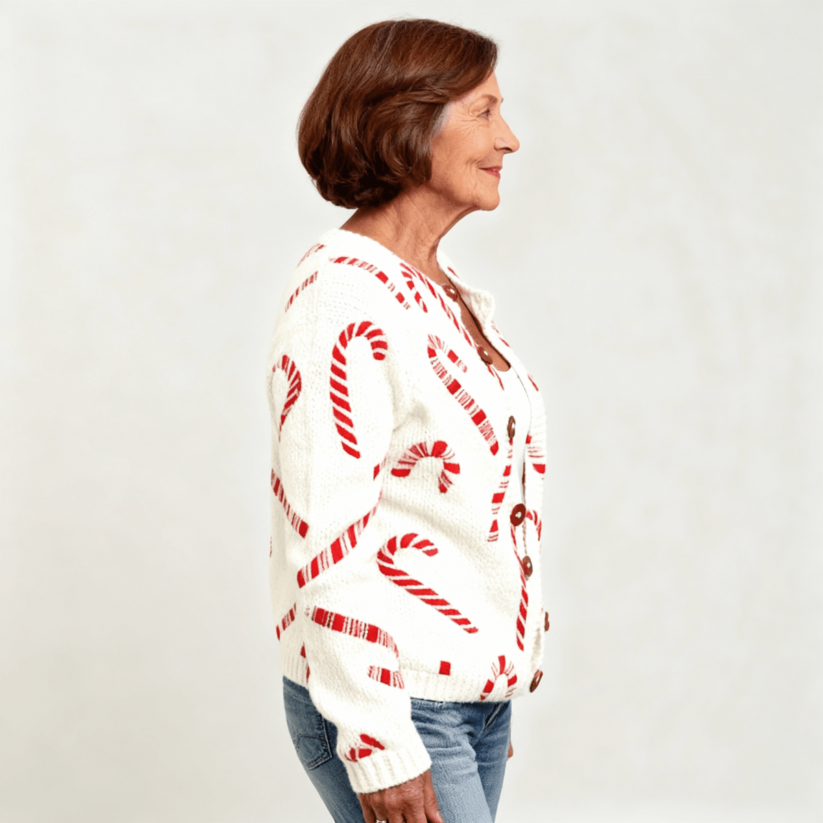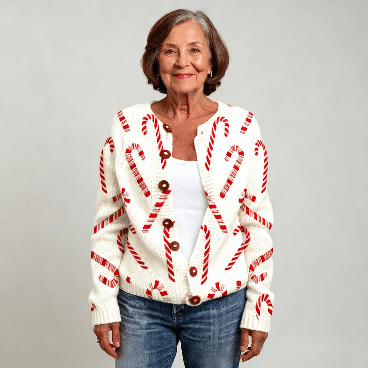 The Carla Cardigan brings effortless holiday spirit to your wardrobe — without being overly flashy. Its soft white knit covered in classic red candy-cane patterns creates a cheerful, festive look that feels warm, uplifting, and wonderfully nostalgic.