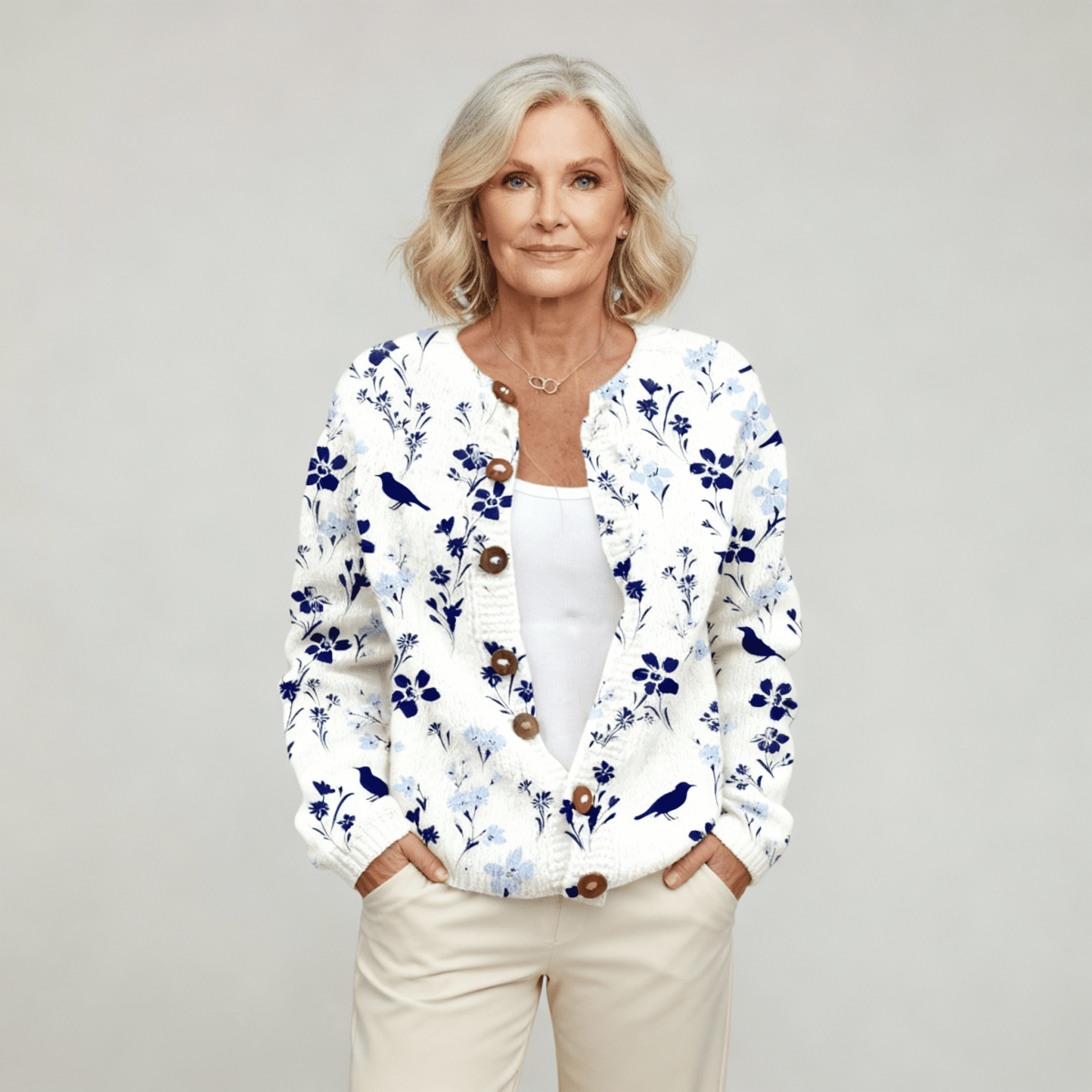 The Maylee Cardigan brings together delicate floral artwork and soft, cozy comfort. Its creamy knit base is decorated with vintage-inspired blue flowers and graceful little birds, creating a peaceful, romantic look that feels perfect for women who love subtle, refined beauty.